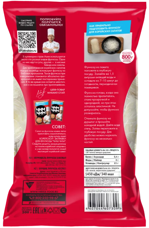 Фунчоза Чим-Чим - традиционная стеклянная лапша из зеленых бобов, широко используемая в рецептах азиатских стран. Этот вид фунчозы хорошо впитывает вкус и аромат соусов, дополняя любимые блюда уникальной текстурой и легкостью. Высокая питательная ценность и отличные насыщающие свойства делают её незаменимой частью здорового питания. Один пакет превращается в целых 800 граммов готового продукта!