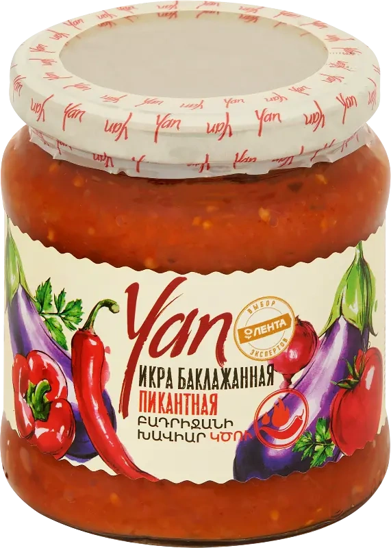 Икра из баклажанов пикантная, YAN представляет собой оригинальную закуску с насыщенным вкусом, приготовленную по особому рецепту, включающему отборные овощи и специи. Благодаря умелому сочетанию ингредиентов, икру отличает выраженный аромат, легкая остринка и приятная кислинка. Она прекрасно подходит как самостоятельная закуска или дополнение к основным блюдам.