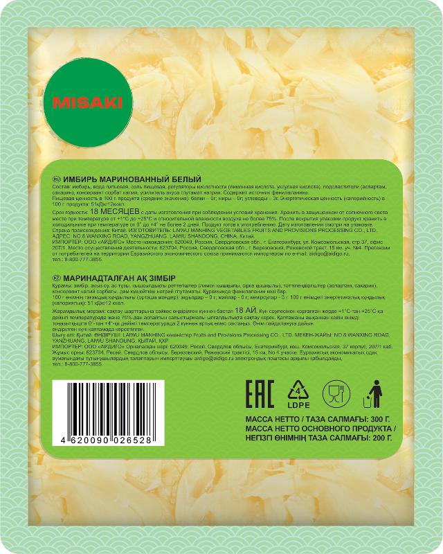 Имбирь маринованный белый Misaki - это изысканный азиатский продукт, который сочетает в себе интересные вкусовые качества и полезные свойства. Имбирь обладает нежным, слегка сладковатым вкусом с легкой кислинкой.