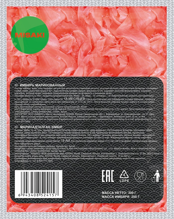 Состав: имбирь; вода; соль; лимонная кислота; уксусная кислота; аспартам сорбат калия; усилитель вкуса (E621); сахарин натрия; пищевой краситель (Е129)