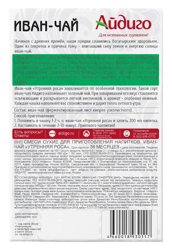 Отборные листья иван - чая собраны до полудня, за счет чего сырье ферментируется естественным образом в утренней росе, а после высушивается в специальной печи. При заваривании чай отличается легкой кислинкой и освежающим ароматом. С каждым глотком иван - чай наполняет Вас спокойствием и теплотой июньского утра. ВЕС: 50 г