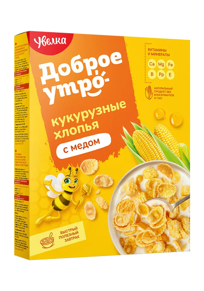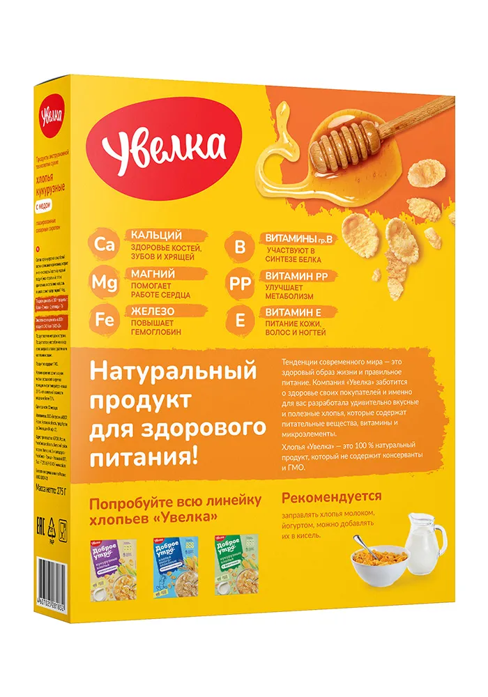 СОСТАВ: крупа кукурузная, сахар белый, патока крахмальная карамельная, экстракт ячменно-солодовый светлый, медовый продукт (мёд натуральный, патока крахмальная, кислота лимонная), соль пищевая, ароматизатор пищевой Мед