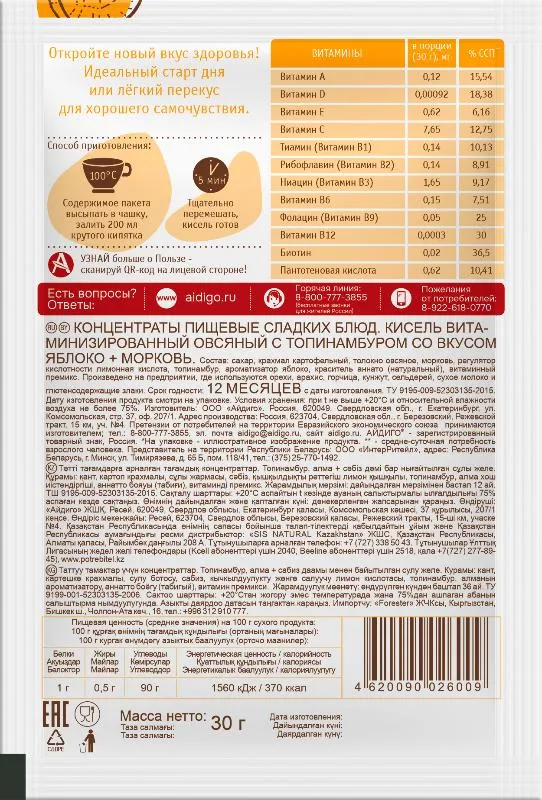 Овсяный кисель с топинамбуром и овсяным толокном для отличного пищеварения, а витаминный комплекс - для повышения иммунитета. В составе витамин А, Д, С, Е, группы В, биотин, пантотеновая кислота.