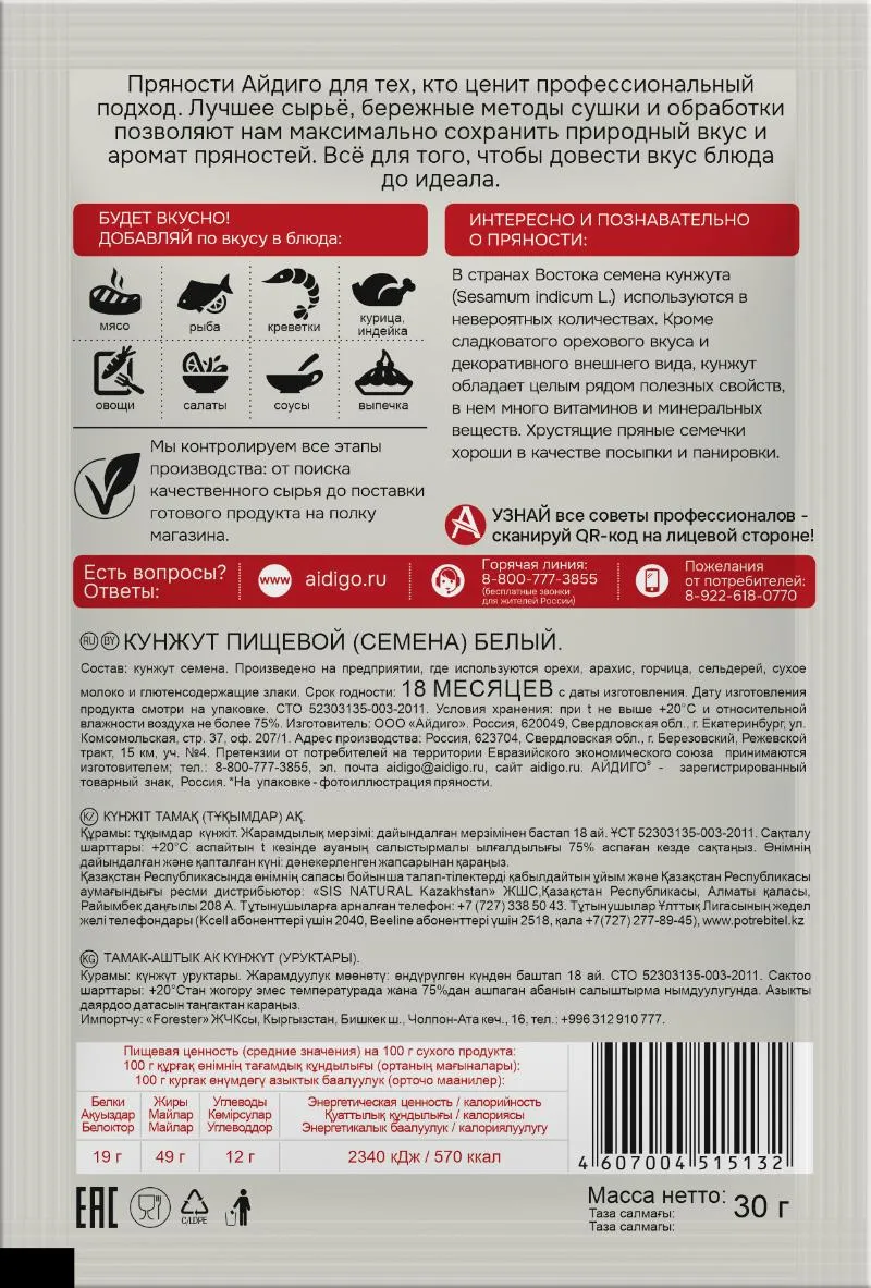 1.Кунжут должен быть сухим и рассыпчатым. И благодаря инновационной упаковке "Айдиго" в кунжут не попадет лишняя влага или пыль.