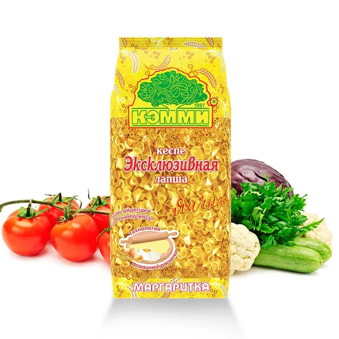 Лапша яичная эксклюзивная "Маргаритка" от КЭММИ производится из твердых сортов пшеницы методом домашней раскатки.