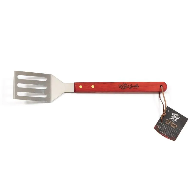 Лопатка РоялГриль для гриля. Эргономичная ручка лопатки РоялГриль обеспечивает удобный и надежный захват, позволяя легко маневрировать с продуктами на гриле. Ее оптимальная длина предотвращает ожоги, сохраняя комфорт в процессе готовки. Специальная конструкция лопатки позволяет легко переворачивать стейки, овощи и другие продукты, не повреждая их структуру и сохраняя сочность.