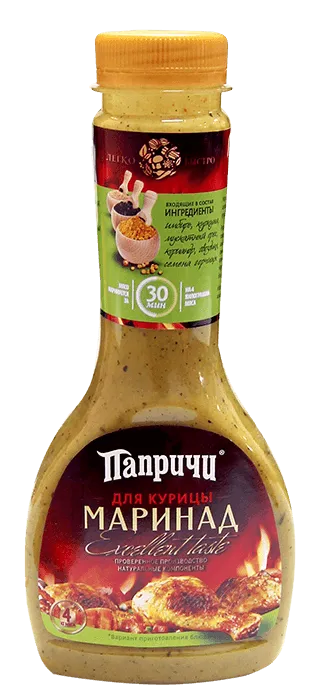 С маринадом для курицы Папричи вы замаринуете птицу всего за 30 минут! Изысканное сочетание пряных трав, французского вина и зерновой горчице придадут курице великолепный вкус и аромат.