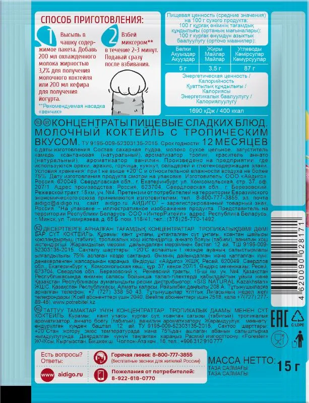 - Молочный коктейль "Тропический" Айдиго на 1 порцию