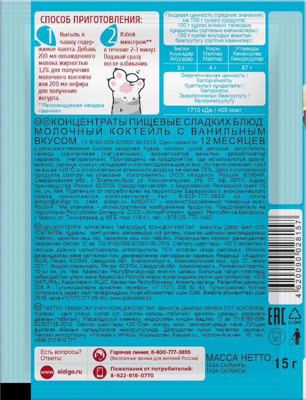 - Молочный коктейль "Ванильный" Айдиго на 1 порцию