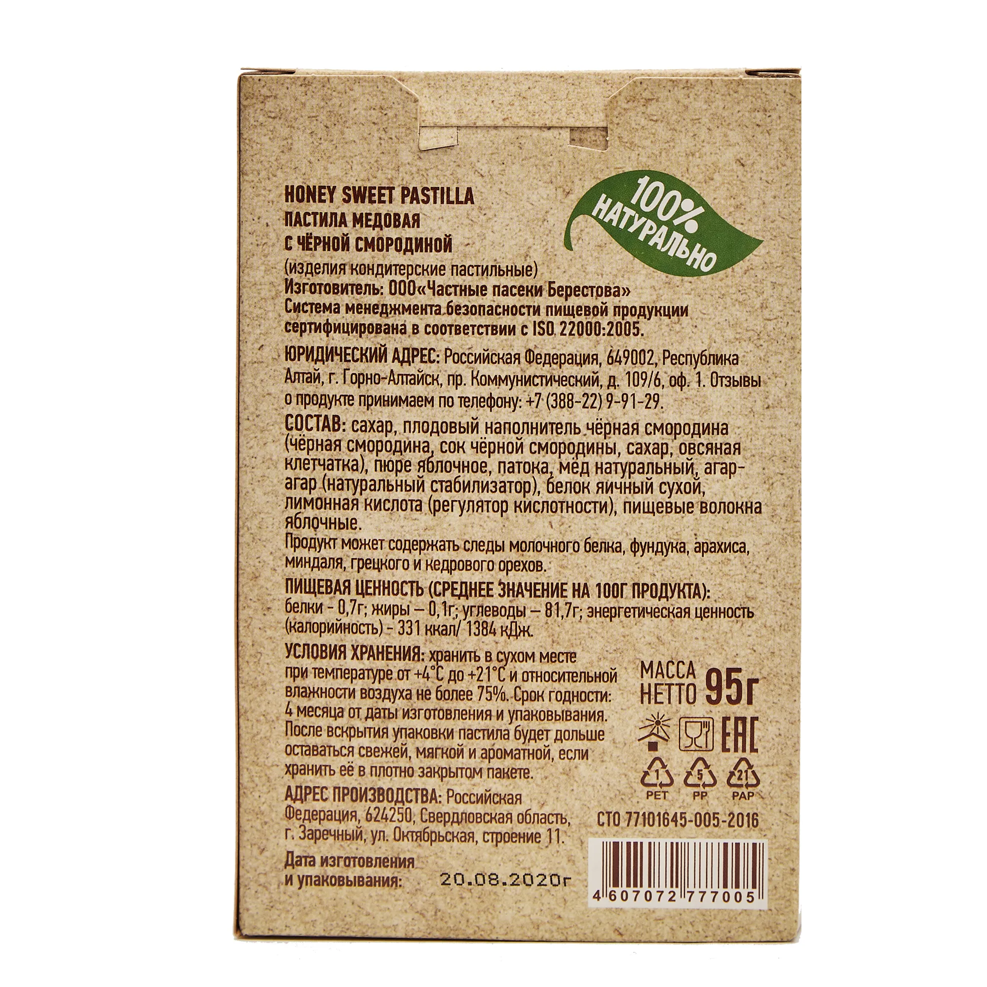 Состав: сахар, плодовый наполнитель черная смородина (черная смородина, сок черной смородины, сахар, овсяная клетчатка), пюре яблочное, патока, мед натуральный, агар-агар (натуральный стабилизатор), белок яичный сухой, лимонная кислота (регулятор кислотности), пищевые волокна яблочные. Продукт может содержать следы молочного белка, фундука, арахиса, миндаля, грецкого и кедрового орехов.