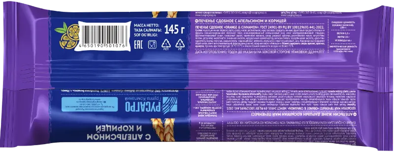 Состав: мука пшеничная, сахар, масло растительное, мука овсяная, продукты яичные, фруктовый продукт «Апельсин» (фрукты (концентрированное яблочное пюре, концентрированный апельсиновый сок), агент влагоудерживающий: глицерин, фруктово-глюкозный сироп, глюкозный сироп, пшеничное волокно, сахар, рисовый крахмал, растительное масло, загуститель: пектин, регулятор кислотности: лимонная кислота, натуральный ароматизатор, антиокислитель: аскорбиновая кислота, краситель, куркумин), корица молотая, разрыхлитель: гидрокарбонат аммония, эмульгатор: лецитин рапсовый, соль йодированная (содержит йодат калия, агент антислеживающий: ферроцианид калия), эфирное масло «Апельсин». Может содержать следы орехов, арахиса, кунжута.