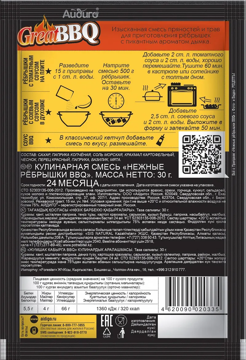 Состав: сахар, паприка копчёная, соль морская, крахмал картофельный, чеснок, перец красный, паприка, базилик, мята.