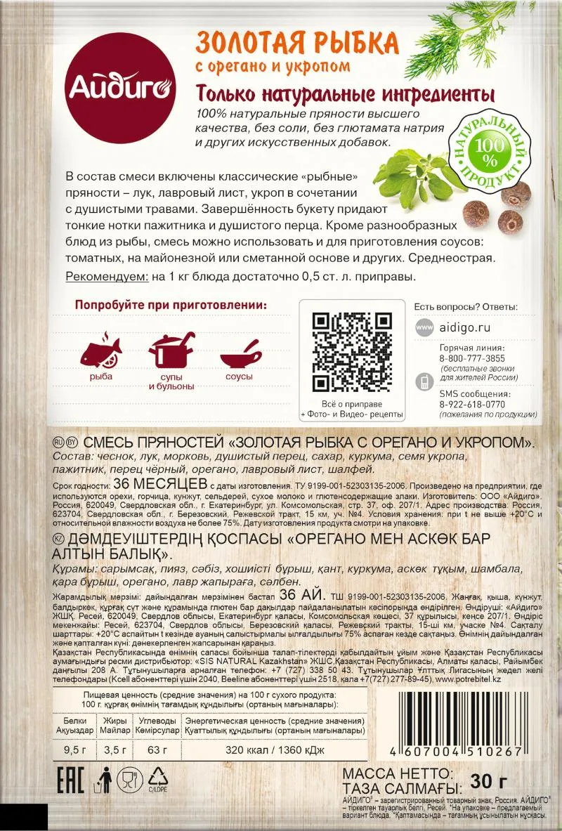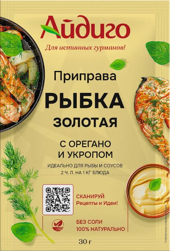 Приправа для рыбы подходит также и для креветок, а также для других морепродуктов. В составе смеси классические «рыбные» пряности – лук, лавровый лист, укроп в сочетании с душистыми травами. Законченность букету придают тонкие нотки пажитника и душистого перца. Средне-острая. Помимо разнообразных блюд из рыбы, смесь можно использовать и для приготовления соусов: томатных, на майонезной или сметаной основе. Рекомендации по применению: на 1 кг блюда достаточно 0,5 ст. л. приправы.