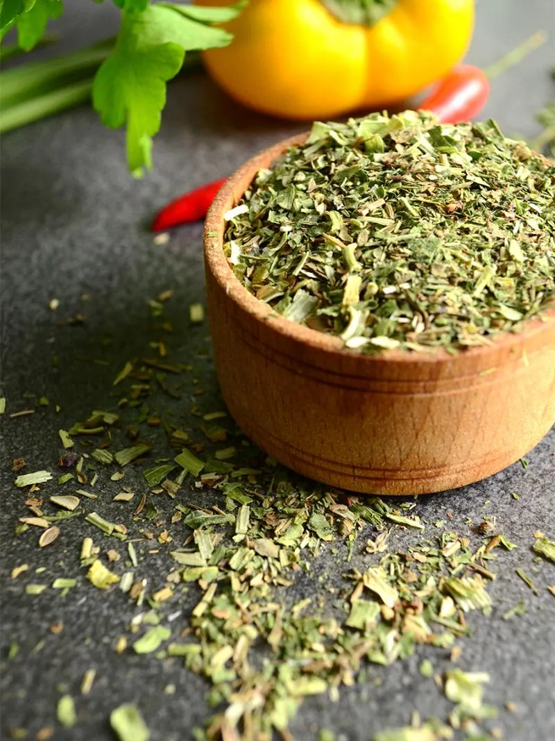 Состав: базилик, лук порей, петрушка, орегано, укроп (семена), розмарин, тимьян.