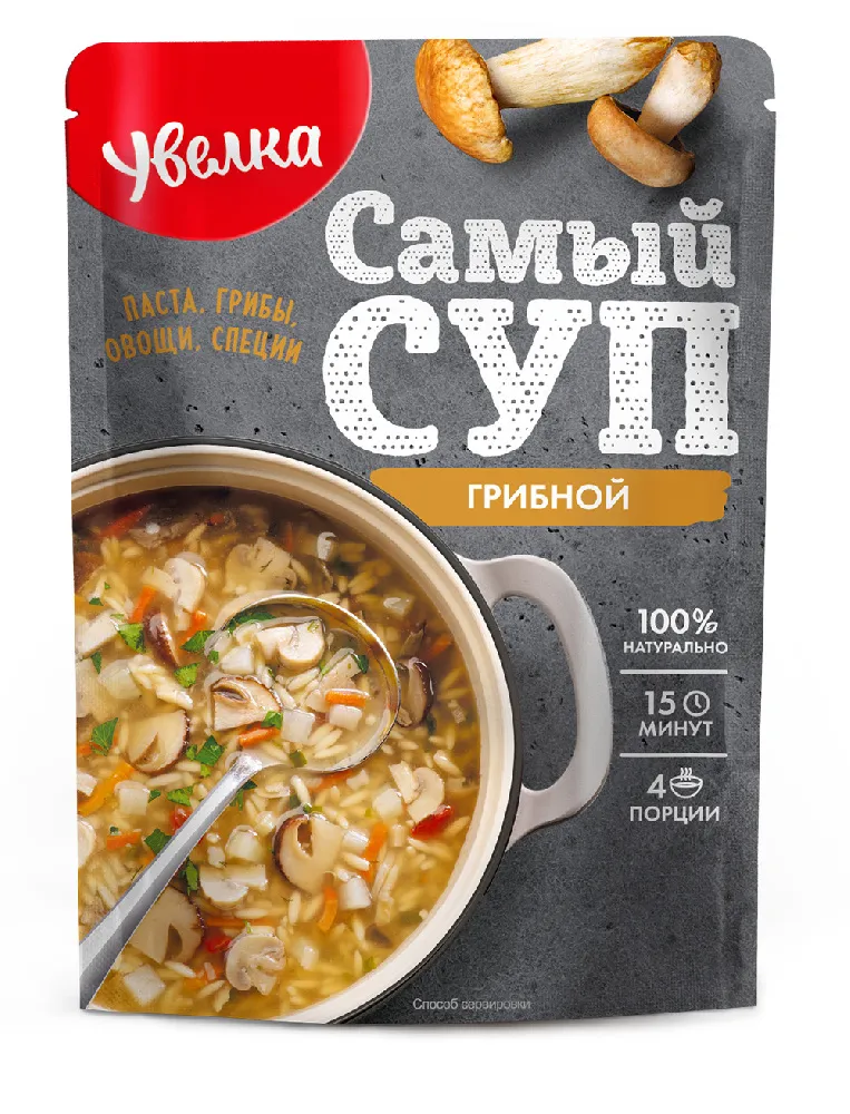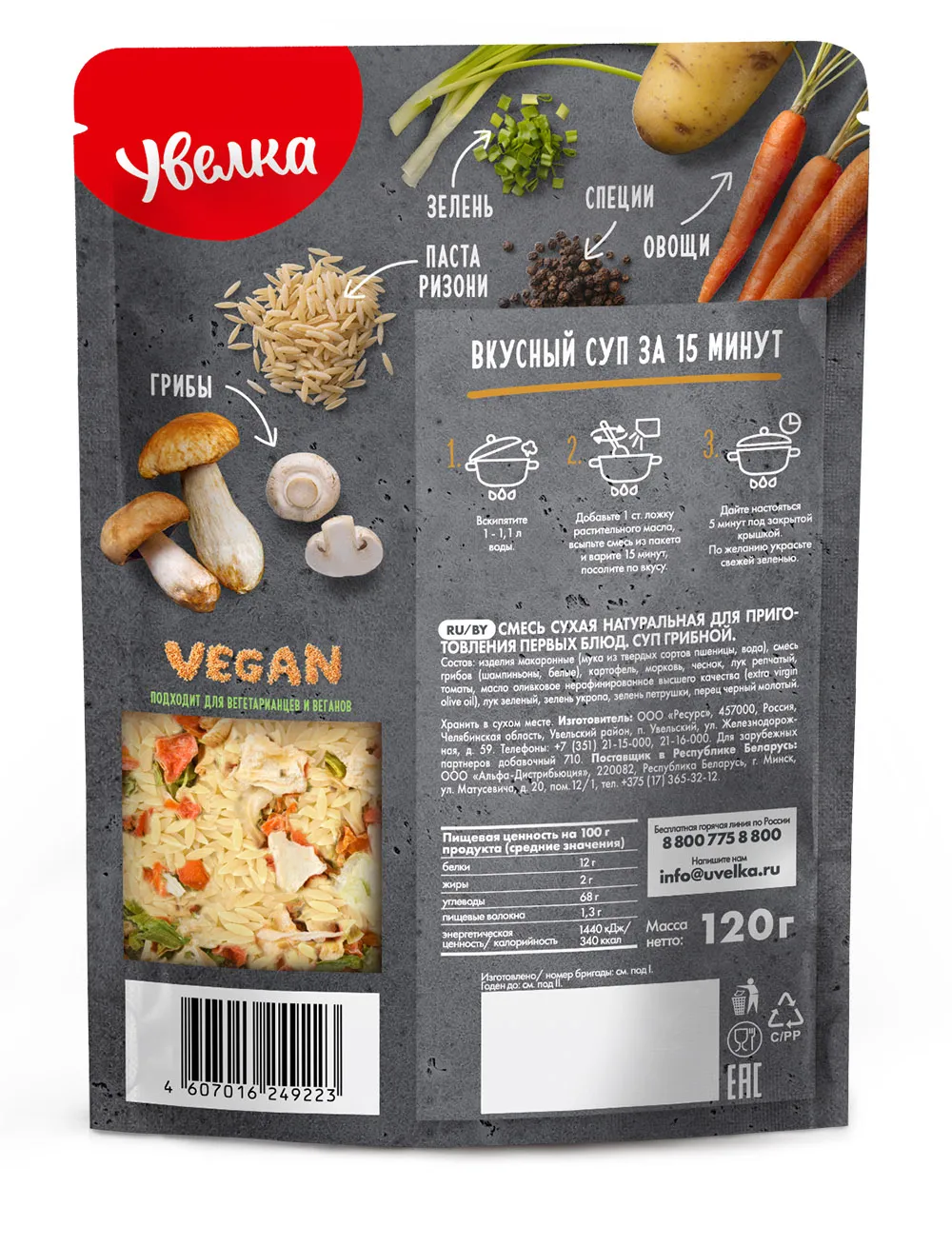Вскипятите 1-1,1 л воды. Добавьте 1 ст. ложку растительного масла, всыпьте смесь из пакета и варите 15 минут. Посолите по вкусу. Дайте настояться 5 минут под закрытой крышкой. По желанию украсьте свежей зеленью. Состав: Изделия макаронные (мука из твердых сортов пшеницы, вода), смесь грибов (шампиньоны, белые), картофель, морковь, чеснок, лук репчатый, томаты, масло оливковое нерафинированное высшего качества, лук зеленый, зелень укропа, зелень петрушки, перец черный молотый Условия хранения: Хранить в сухом месте.