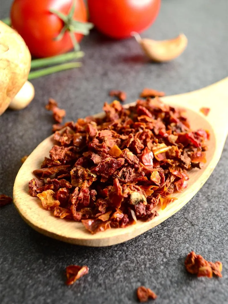 Равноценная замена свежим помидорам при приготовлении блюд. Использование этой пряности универсально - красивыми кусочками можно украсить салаты, макароны, добавить в омлет. Супы, благодаря этой добавке, приобретут приятный оранжево-красный оттенок. Стоит использовать дробленые томаты при приготовлении мясных и овощных кушаний. Эту пряность можно использовать при выпечке несладких булок и хлеба.