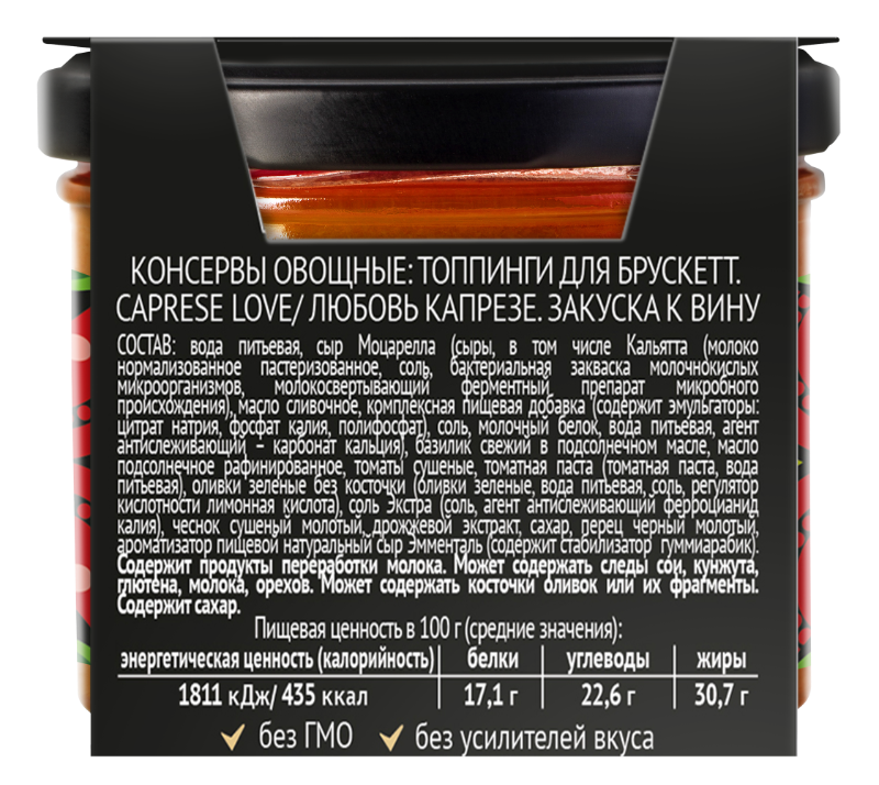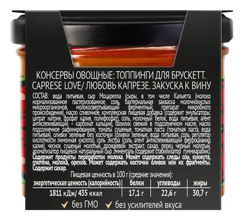 Состав: вода питьевая, сыр Моцарелла (сыры, в том числе Кальятта (молоко нормализованное пастеризованное, соль, бактериальная закваска молочнокислых микроорганизмов, молокосвертывающий ферментный препарат микробного происхождения), масло сливочное, комплексная пищевая добавка (содержит эмульгаторы: цитрат натрия, фосфат калия, полифосфат), соль, молочный белок, вода питьевая, агент антислеживающий - карбонат кальция), базилик свежий в подсолнечном масле, масло подсолнечное рафинированное, томаты сушёные, томатная паста (томатная паста, вода питьевая), оливки зелёные без косточки (оливки зелёные, вода питьевая, соль, регулятор кислотности лимонная кислота), соль (соль, агент антислеживающий ферроцианид калия), чеснок сушёный молотый, дрожжевой экстракт, сахар, перец чёрный молотый, ароматизатор пищевой натуральный сыр Эмменталь (содержит стабилизатор гуммиарабик).