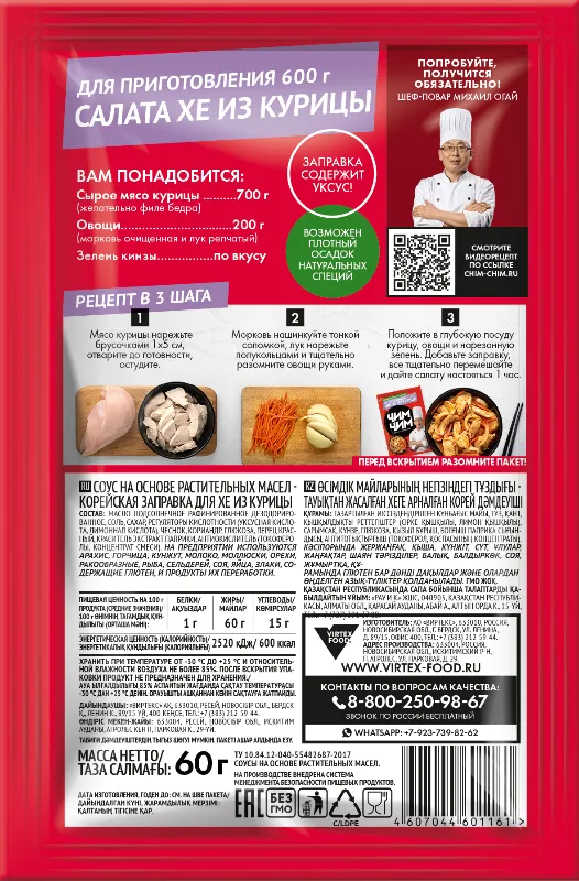 Для приготовления хе кроме самой заправки понадобятся только курица и нашинкованные овощи, время настаивания салата составляет всего 1-2 часа. Благодаря уникальной технологии смешивания ингредиентов, они сохраняют сок, получаются очень свежими и сочными, с ярким «солнечным» блеском.