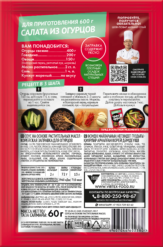 Заправка корейская для огурцов, Чим-Чим - приготовьте традиционные корейские огурцы легко и быстро с оригинальной заправкой "Чим-Чим"! Натуральный состав бережно раскрывает свежие огуречные оттенки, придавая вкусу необходимую пикантность и сочность. Используйте готовый продукт сразу или дайте настояться немного дольше - и получите идеальный гарнир или самостоятельное блюдо для всей семьи.