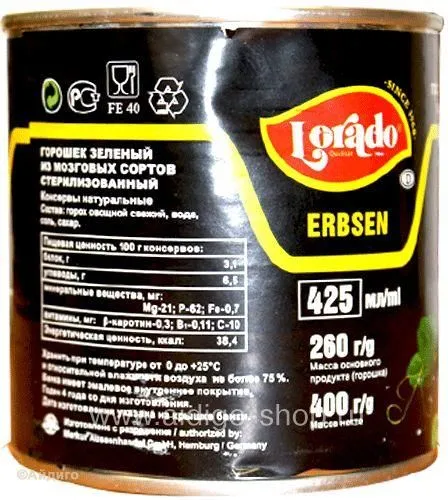 Консервированный зеленый горошек принадлежит к лучшим и наиболее популярным овощным консервам. Горошек ТМ «Lorado» вырабатывают из молодых зерен специальных сортов горошка в их, так называемой, молочной стадии зрелости, когда зерна горошка особенно нежны и наиболее богаты витаминами и питательными веществами.